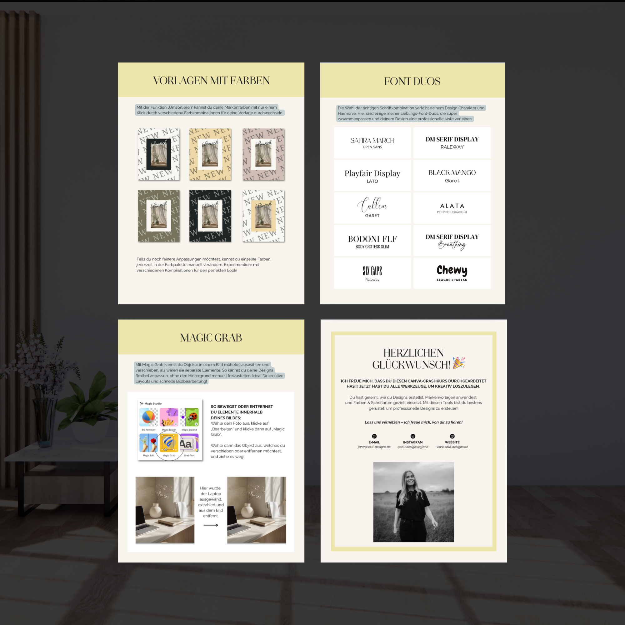 Damit du sofort in die Umsetzung gehen kannst, erhältst du ein vorgefertigtes Template-Set in Canva – angepasst an deine Farbpalette und deine Schriften.